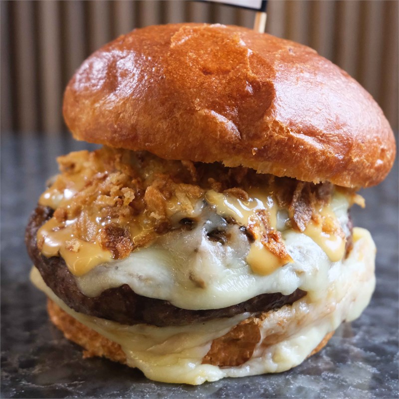 Котлета из говядины, жареная на гриле с добавлением зеленого масла. Подаётся на фирменной булочке бриошь с добавлением обжаренных вешенок, двойного сыра, хрустящего жареного лука. Заправлен двумя соусами: устричный и майонез-терияки. Подается с малосольным огурцом