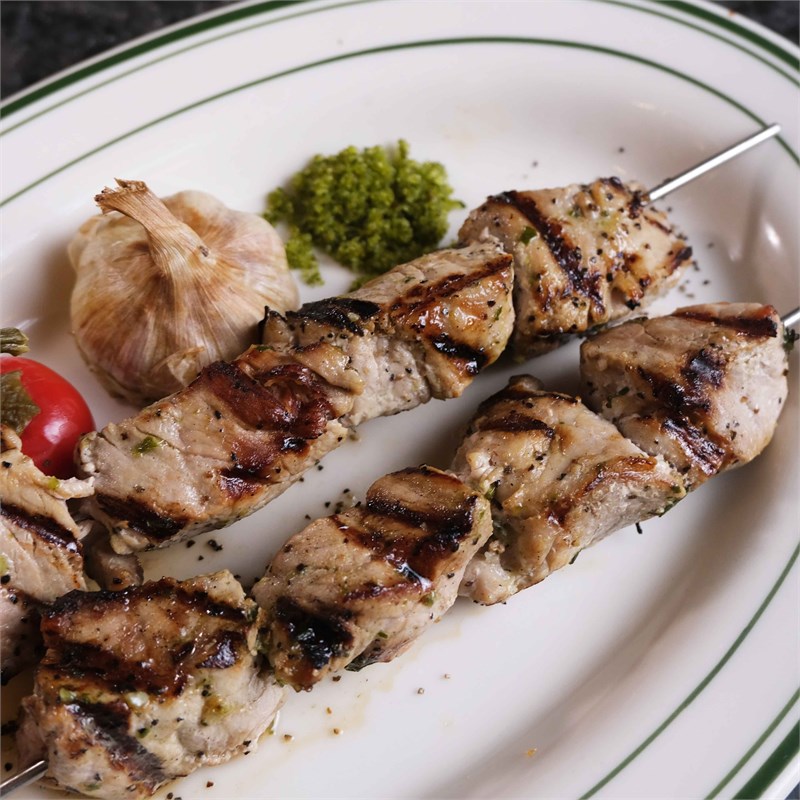 Шашлык (2 шампура) из нежной свиной вырезки. При приготовлении шашлыка используется маринад из репчатого лука, тимьяна, дробленого черного переца и оливкового масла
